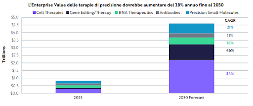 Secondo una ricerca di ARK Investment Management, l'introduzione di terapie di precisione, potenziate da tecnologie come l'editing genico CRISPR, il sequenziamento e l'intelligenza artificiale, potrebbe far crescere il valore delle aziende del settore a un tasso annuo composto (CAGR) del 28% nei prossimi 7 anni, passando da 820 miliardi di dollari nel 2023 a 4.000 miliardi di dollari entro il 2030.