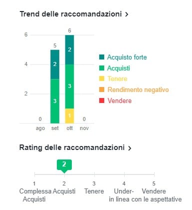 Le previsioni degli analisti sembrano concordare sull'acquisto, con la maggior parte degli analisti che si orienta verso l'acquisto forte o l'acquisto, e una minoranza che invece si orienta verso il tenere.