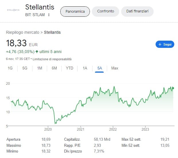 Da un'analisi del grafico a 5 anni possiamo innanzitutto dedurre che la società si caratterizza per una certa solidità sul lungo periodo, con una crescita pari al 35%. La volatilità del titolo è tendenzialmente piuttosto alta, e corrisponde ai cicli economici, come quello che si è verificato nelle prime fasi del covid, dove il titolo ha registrato una netta riduzione del valore, oppure nel 2022, in corrispondenza della crisi energetica. Il prezzo attuale dell'azione è di 18,33 euro, vicino al prezzo massimo. Con un P/E di 2.93, il titolo potrebbe essere sottovalutato dal mercato.