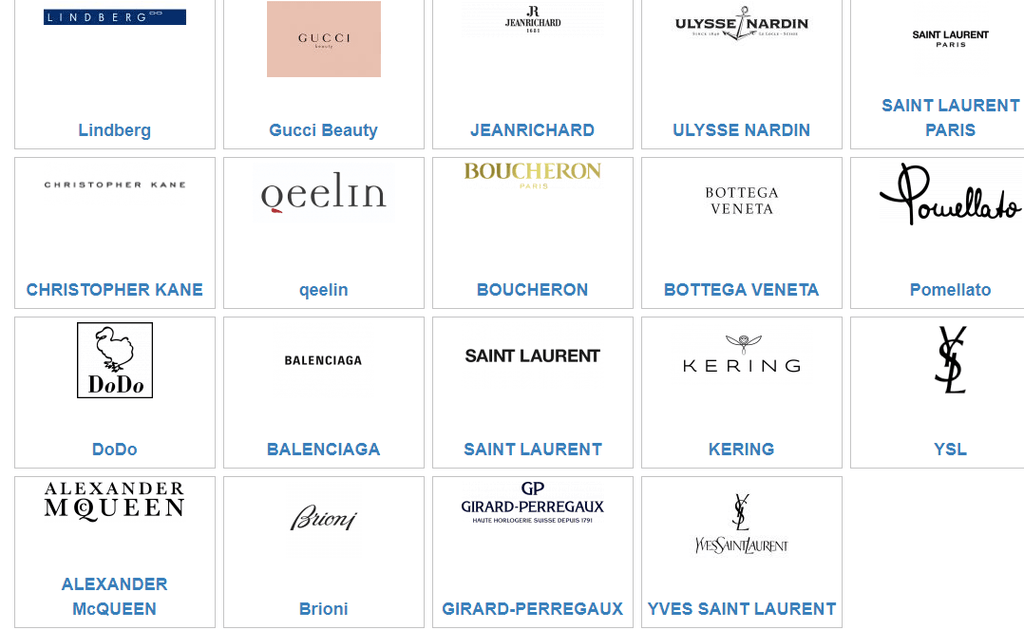 Kering adotta un modello multimarca e verticale, focalizzato su Moda, Pelletteria, Gioielli oltre a Eyewear. Tra le Maison: Gucci, Saint Laurent, Bottega Veneta, Balenciaga, Alexander McQueen, Brioni, Boucheron, Pomellato, DoDo, Qeelin, Ginori 1735, più Kering Eyewear. Nel 2024 il gruppo contava 1.813 negozi diretti.