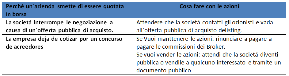 Ci sono molteplici ragioni per cui una società interrompe la quotazione, potrebbe essere che qualche altra società abbia acquistato la maggioranza delle azioni e gran parte dei suoi azionisti non abbia partecipato all'offerta, o forse sia stata temporaneamente sospesa per fallimento, o che dichiari il fallimento e le sue azioni cessano di essere negoziate definitivamente.