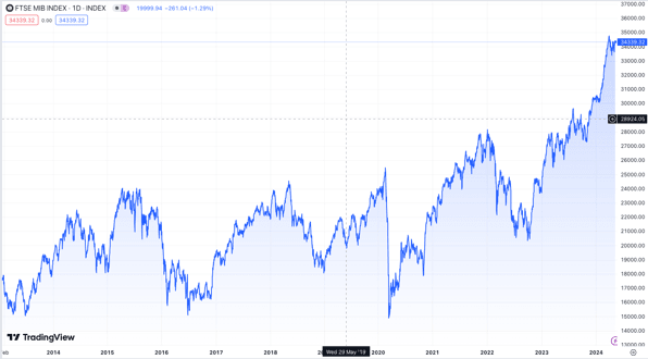 Guardando al 2024, le prospettive per il FTSE MIB sembrano promettenti, sebbene si debbano considerare alcuni rischi. Presupponendo che il contesto politico rimanga stabile e che le politiche economiche continuino a favorire la crescita, si può ragionevolmente aspettare che l'indice mantenga un trend positivo. Tuttavia, le dinamiche globali, come le tensioni geopolitiche, i cambiamenti nelle politiche monetarie delle principali economie, e eventuali shock economici internazionali, potrebbero influenzare l'andamento dell'indice.