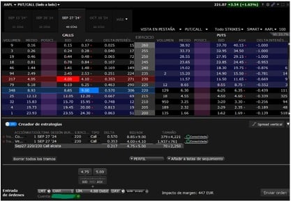 Vediamo un esempio di come apriremmo un Call Debit Spread sull'azione AAPL utilizzando la piattaforma Trader Workstation di Interactive Brokers:
