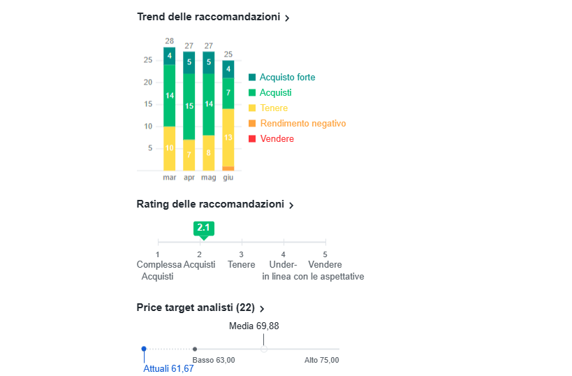 Le azioni Coca Cola vengono considerate fra gli investimenti più sicuri, stabili e redditizi sul lungo termine e come è possibile notare dal grafico la maggior parte degli analisi si orientano verso l'acquisto o il tenere, mentre il price target medio è a 69,88$ dai 61,67$ dollari attuali.