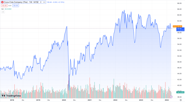 Le azioni Coca Cola sono quotate alla borsa di New York (NYSE) e vengono scambiate con il codice KO. Possiamo osservare, nel grafico che segue, una crescita lenta ma stabile e costante.
