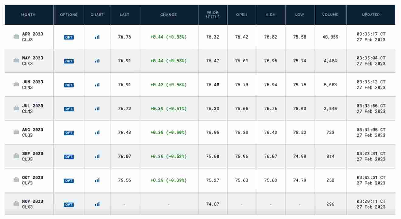 I contratti futures sul petrolio hanno la dimensione di 1000 barili. Le piazze finanziarie dove viene negoziato il petrolio sono il Chicago Mercantile Exchange, il New York Mercantile Exchange, l’Intercontinental Exchange di Londra, senza trascurare altri mercati importanti come quelli di Tokio, Shangai, Mumbai. La scadenza dei contratti, come si evince anche dalla tabella seguente, è mensile.