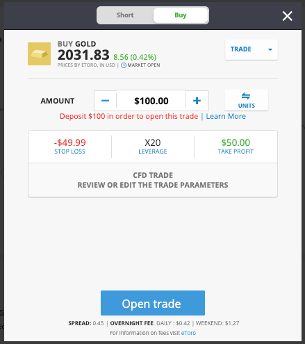 Dopo aver aperto una posizione sull'oro, questa sarà visibile nella sezione "portafoglio". Qui, avrai accesso a strumenti per monitorare l'evoluzione dei tuoi guadagni o perdite. Puoi impostare manualmente gli strumenti di stop loss e take profit sia durante che dopo l'apertura di una posizione. Se il prezzo dell'oro raggiunge un certo livello, questi strumenti scattano automaticamente chiudendo la posizione.