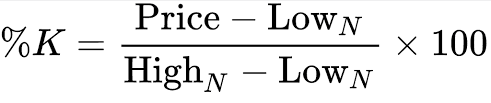 Di solito il calcolo dell’oscillatore stocastico si fa presso la piattaforma di trading, per cui non ci sarà bisogno di farlo. Nonostante ciò, vi offriamo la formula ed il calcolo per comprendere la logica dietro il funzionamento dell’oscillatore. Infatti: