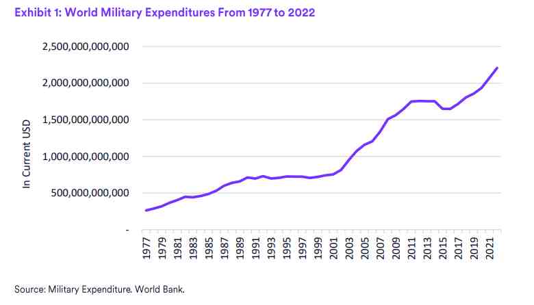 Dal 1977 al 2021 le spese militari globali sono aumentate da circa 250 miliardi di dollari a più di 2.000 miliardi di dollari.