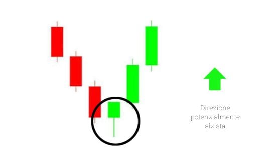 Questo modello è chiamato Bullish Hammer candlestick in inglese. La candela ha un corpo piccolo e un'ombra inferiore lunga, l'ideale è che sia almeno il doppio del corpo.