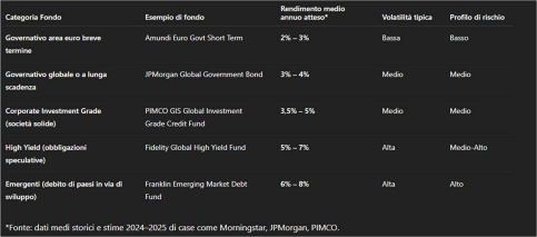 | Quando usarli in portafoglio | - Come nucleo della componente obbligazionaria per investitori che vogliono rendimento moderato con rischio controllato. - Possono sostituire o completare i governativi per migliorare il rendimento nominale del portafoglio senza assumere il livello di rischio di un fondo high yield. |