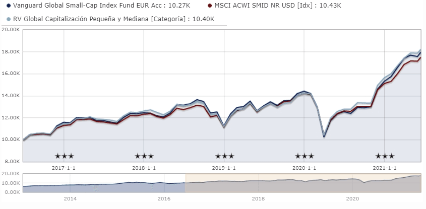 La cosa curiosa di questo fondo, però, è che supera la media della categoria pur mantenendo una volatilità simile (16,60% in tre anni). In altre parole, il Vanguard Global Stock Index Fund Investor ottiene rendimenti extra pur mantenendo lo stesso rischio. Ha un punteggio di 6 su 7 sulla scala.