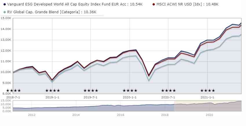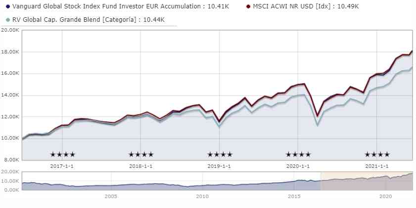 Un altro dei fondi indicizzati di Vanguard con rendimenti interessanti a medio e lungo termine, sopra la media della sua categoria di fondi comuni, è il Vanguard Global Stock Index Fund Investor. Ha anche un rating Morningstar a quattro stelle.