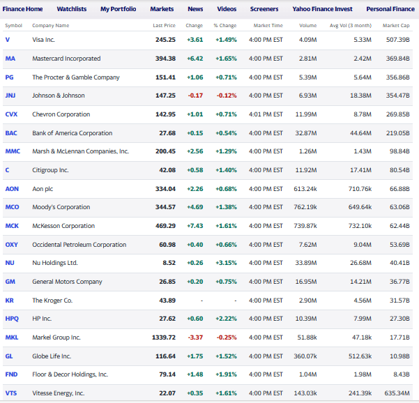 Volendo riportare un esempio di portafoglio azionario idoneo per un investimento di lungo periodo, possiamo guardare alle azioni detenute dalla Berkshire Hathaway, società fondata dal investitore leggendario Warren Buffett, che da oltre 60 anni è riuscito ad ottenere performance superiori alla crescita media del mercato investendo principalmente in aziende quotate. In alternativa potete studiare il portafoglio permanente di Harry Browne.