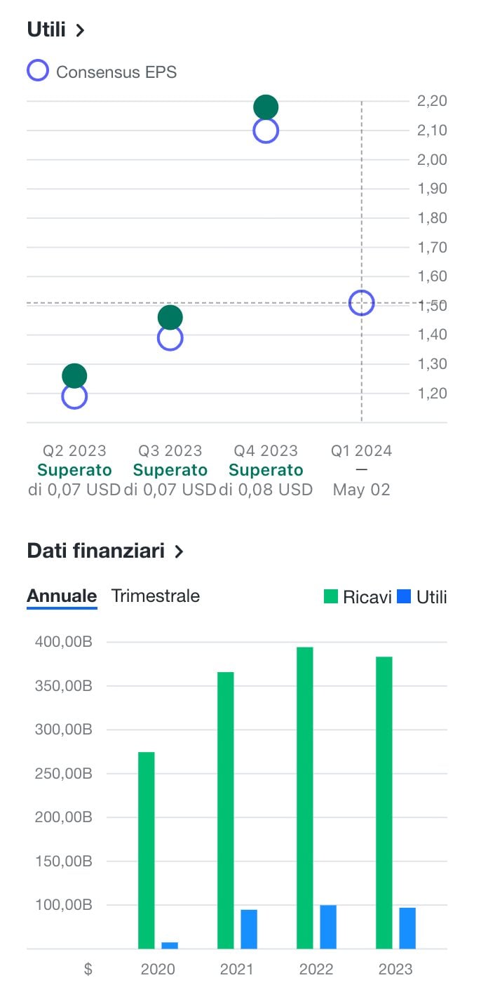 Nell'ultimo anno completo, Apple ha registrato un fatturato record di 387 miliardi di dollari, con un aumento di quasi il 40% rispetto all'anno precedente. L'azienda ha registrato un utile per azione di 5,61 dollari, in crescita rispetto ai 3,28 dollari dell'esercizio 2021.