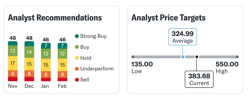 Come possiamo osservare, il sentiment prevalente è quello del "mantenimento", con più di un terzo degli analisti che suggerisce di tenere le azioni, basandosi su 46 valutazioni complessive. Inoltre, il prezzo attuale di Tesla si trova al di sopra della media stimata dagli analisti, il che suggerisce una possibile situazione di euforia o di ipercomprato sul titolo.