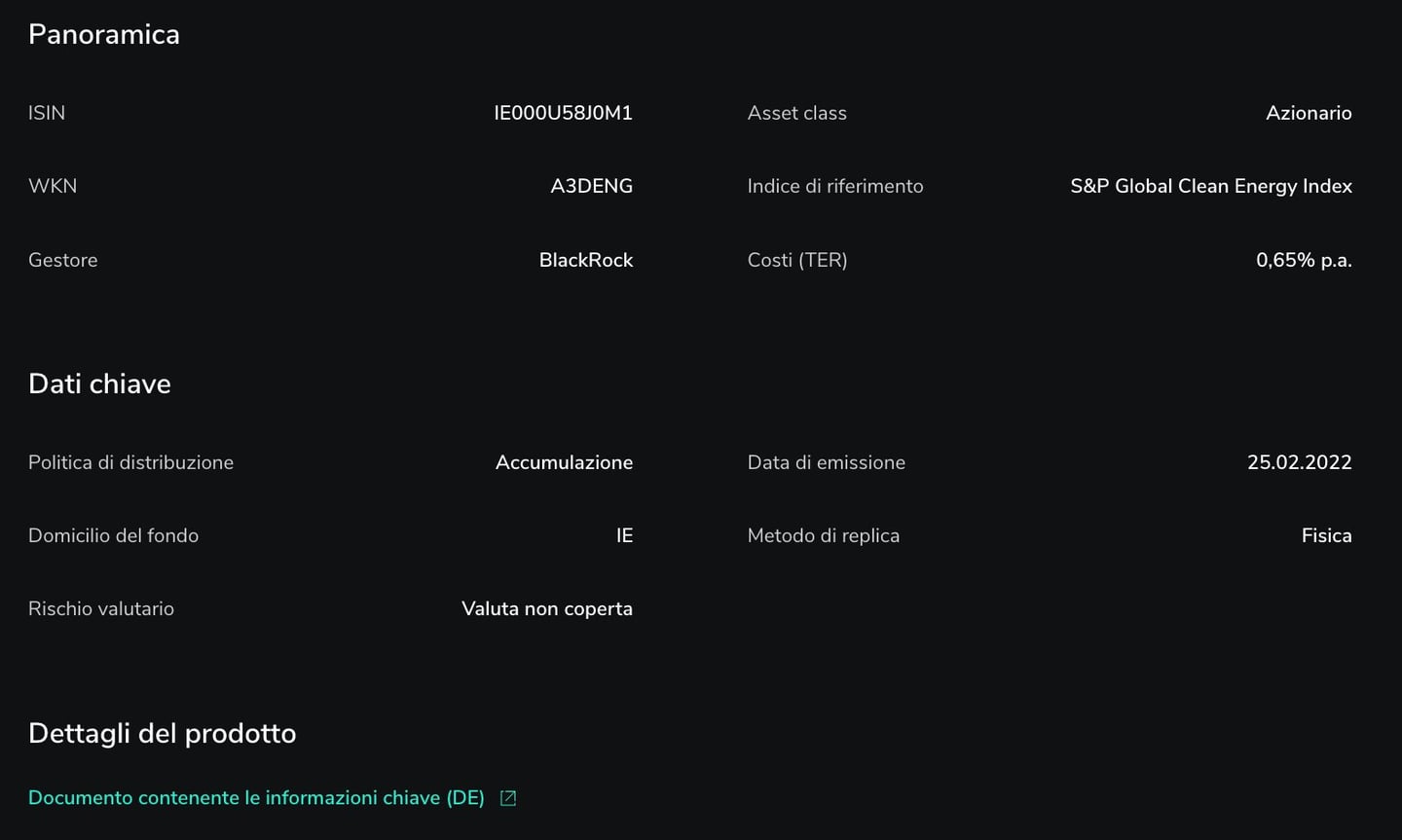 iShares Global Clean Energy UCITS ETF è un ETF che ti consigliamo di attenzionare in modo particolare. Un suggerimento pratico potrebbe essere quello di investire nel caso in cui tu voglia “sacrificare” una piccola parte del tuo capitale e scommettere sul fatto che tra 10 anni i soldi si siano moltiplicati. Sarebbe un investimento sicuro, ma data la lunghezza dell’investimento si tratta di una vera e propria scommessa per il futuro.