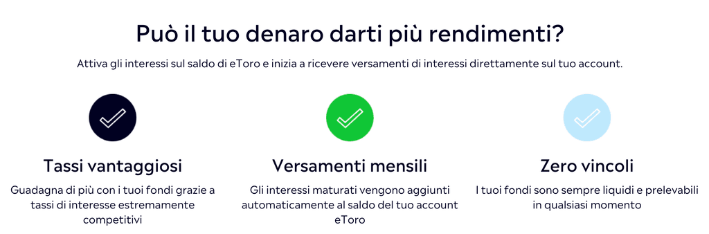 Se apri un conto con eToro e appartieni al Club, puoi accedere a tassi di interesse crescenti sui fondi non investiti, che arrivano fino a circa il 3,8% annuo sui saldi idonei, a seconda del livello Club e della valuta.